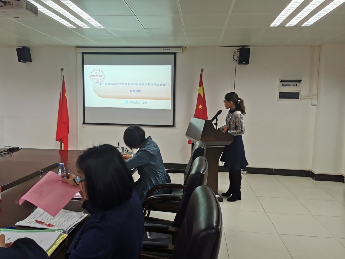 青年課題項目《基于英語學習活動觀的初中英語評判性閱讀教學的實踐研究》的主持人王玫老師作開題報告。2018年立項的課題《農村初中英語聽說教學與信息技術的深度融合研究》的主持人曾憲貞老師作了全面的中期審查報告。張泰剛老師對兩個課題進行科學全面地指導。張老師再三強調,作研究必須嚴謹、科學、客觀。