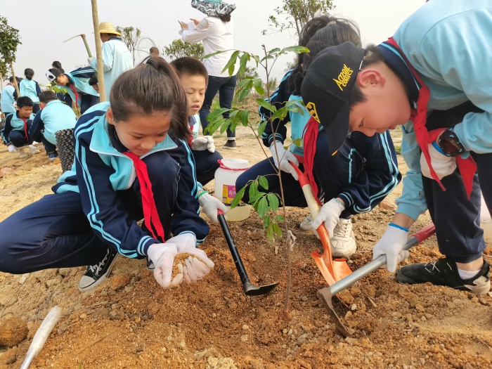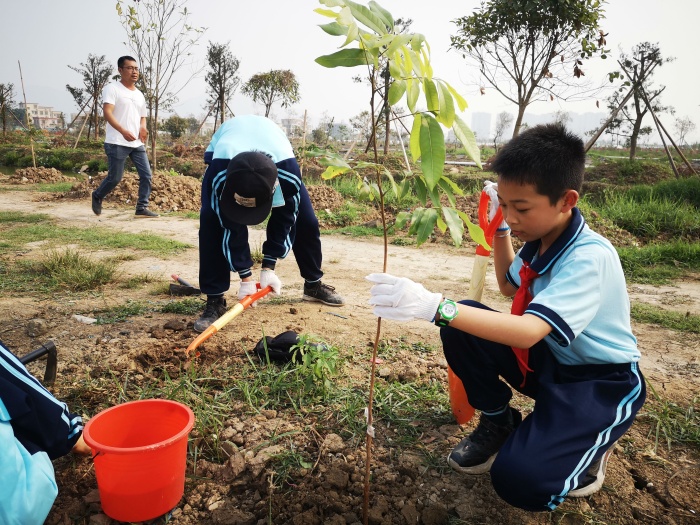 下午兩點,全校師生在余壁峰校長和老師們的帶領下從學校出發,步行到坦洲鎮安阜村新萬農業安阜生態園開展植樹活動。在植樹之前,新萬農業生態園的負責人為學校師生演示講解如何種樹并提醒學生注意安全。在活動中,校長為每組成員分發樹苗,老師與學生們一起挖坑、填土、澆水,扶苗。春天種植希望也為地球母親添上了一抹亮麗的綠色。在活動中,專業科學老師黃啟成和孩子們一邊種植,還一邊教他們認識植物、講解植物的小常識,怎樣護理小植物們。