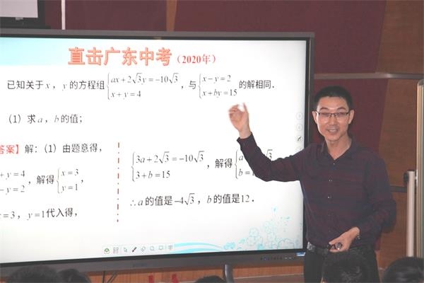 第二節是坦洲實驗中學柳清泉老師的《一次方程(組)的解法及應用》復習課。柳主任整節課由預習反饋、直擊中考、知識要點、核心考題四環節形成。這是一堂務實且充實的一節課,課堂中柳老師對知識講練結合,及時反饋,將“實”與“穩”體現得淋漓盡致,整節課目標明確,夯實基礎,突出了“四實”:一是扎實備課,二是扎實上課,三是扎實輔導,四是扎實育人。柳主任整節課明確了講什么,為何講,怎么講,同時體現了學生練什么,為何練,怎么練的問題。在課堂中,柳主任將知識進行了整合,并進行變式遷移,突破了學生的易錯點與方法的應用。同時,整堂課中柳主任心穩,氣穩,語言穩,關注每一位學生,鼓勵回答問題的學生,追蹤做錯題的學生,讓學生明目標,樹信心,收獲滿滿的成功感。