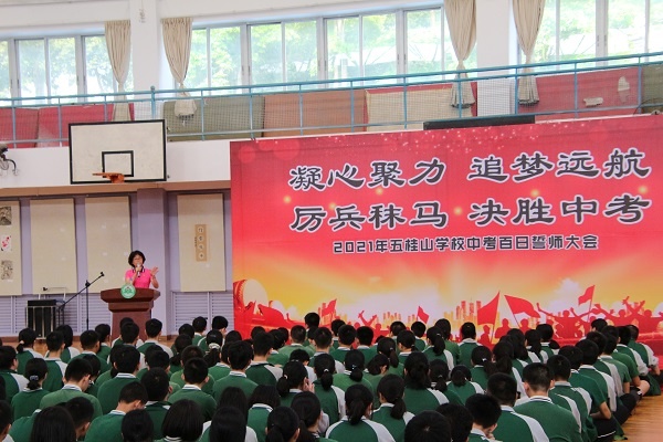 三年的汗水,千日的付出,終將結成六月的碩果。誓師大會上,老師們集體宣誓,要為學生們保駕護航精心備考;家長們鄭重承諾,要成為孩子們最堅定的支持者,全力以赴為孩子們做好一切與中考有關的后勤保障。最后,五桂山學校黨支部書記陳玉玲同志致辭,她希望同學們以百年黨史作為精神食糧激勵自己,少一些浮躁,多一些行動,以飽滿的熱情,堅定的信念,迎難而上,以最佳的精神狀態和最充分的知識儲備迎戰中考。