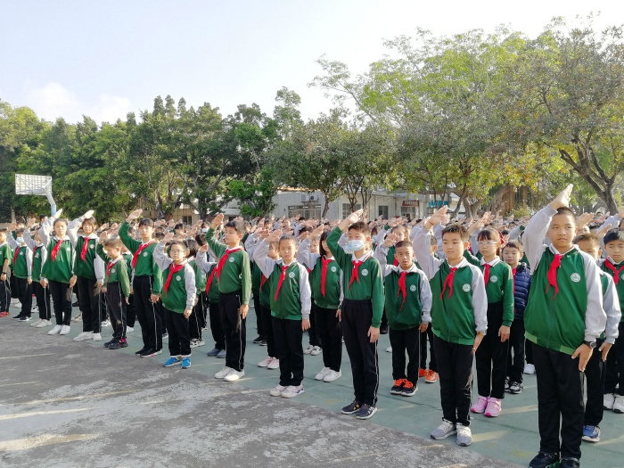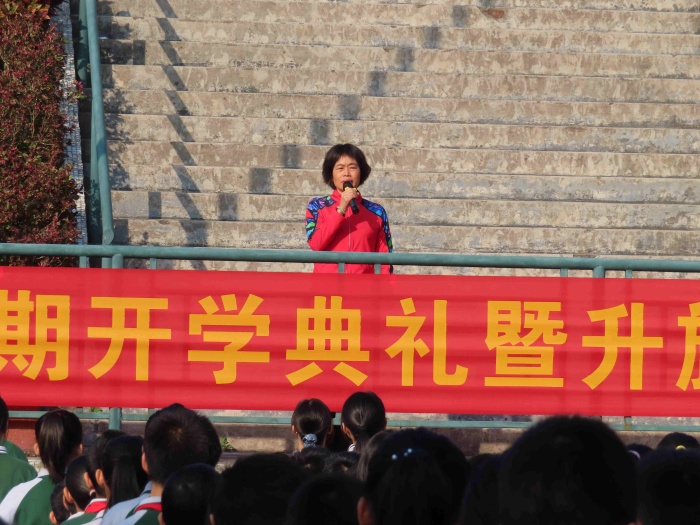 上午8:30分,全校師生排著整齊的隊伍來到學校籃球場參加開學第一次升旗儀式暨開學典禮。升旗儀式上,全體師生肅立,少先隊員行隊禮,高唱著國旗,注視著冉冉升起的國旗,心潮澎湃。