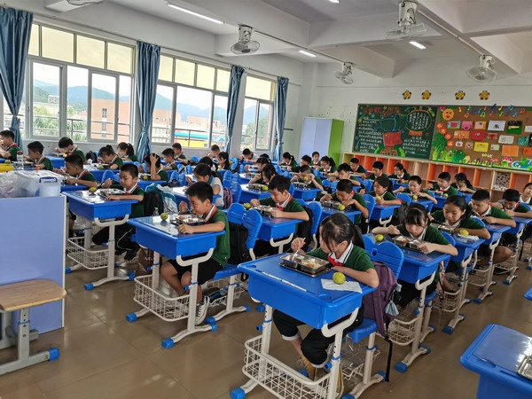 中午就餐時(shí),飯?zhí)媒y(tǒng)一配餐送到教室。在老師的指揮下,孩子們自覺(jué)保持安全距離,午間就餐排隊(duì)距離1米以上,專(zhuān)人專(zhuān)坐,學(xué)生坐在自己的座位上文明用餐,避免了人員接觸。沒(méi)有了往日的三五成群、交頭接耳的情況,疫情防控意識(shí)已深深植根于每個(gè)孩子心中。