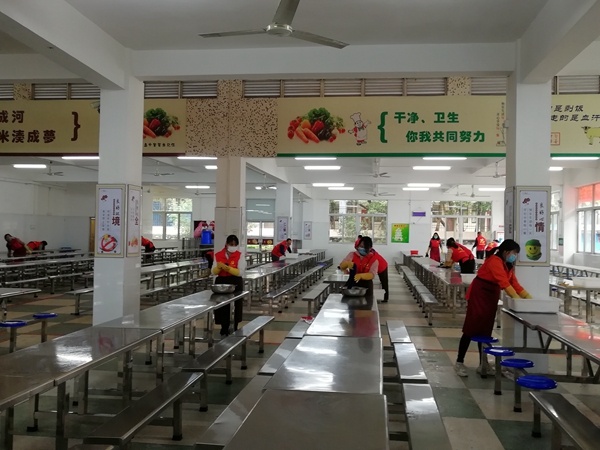 全體后勤人員行動起來。學校后勤人員清洗飲水設施設備,檢查維修水電設施設備,想方設法準備開學的各項防疫物資儲備,宿舍的清潔、消毒,宿生的床位安排,洗手盆的增加,事無巨細,周密安排。全體外包服務公司也行動起來。校園環境的美化、清潔與消毒,飯堂的清潔、消毒,座位的安排,標識的優化。所有一切都是為了讓師生回校后有一個明確的指引,確保師生的健康與安全。