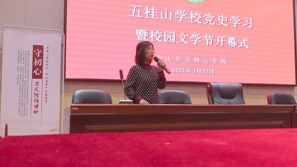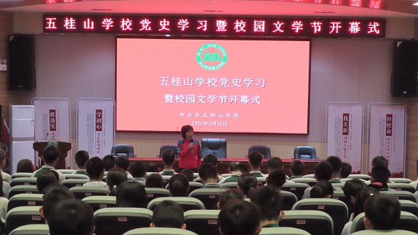 2021年3月22日清晨,春風細雨,綠意盎然。五桂山學校以“四月芳菲 書香校園”為主題的文學節開幕式正伴著“學習黨史”的升旗儀式莊嚴肅穆地舉行。中山市離退休干部宣講團成員、中山市委黨史研究室原主任郭昉凌應邀為師生們講述“五桂山為什么是英雄的五桂山”的故事。前來參加活動的還有中山市老干部局宣講科王嘉述科長、市紅十字會傳統文化保育與傳承志愿服務隊隊員。