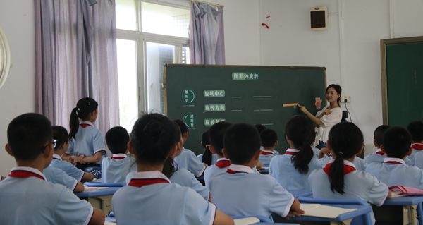 首先,胡柳老師和五(2)班學生上了一節《圖形的旋轉》。胡老師通過生活中的旋轉現象:例如鬧鐘的時針,風扇、風車的轉動,旋轉木馬的旋轉等等,引入新課——圖形的旋轉。課件上出示了一根指針和一只小熊,胡老師提問:“哪位同學能說出明確的指令,使指針一下子指向小熊?”進而引出旋轉的三要素,旋轉中心,旋轉方向,旋轉角度。課堂上學生踴躍回答,學習氣氛濃厚,語言表達也很清晰。整節課時間把握得當,教學環節設計合理,獲得了大部分老師的好評。