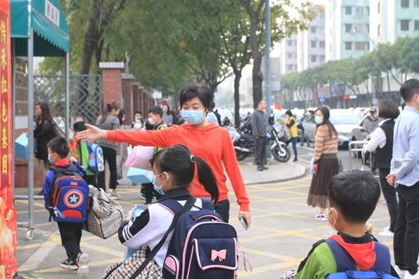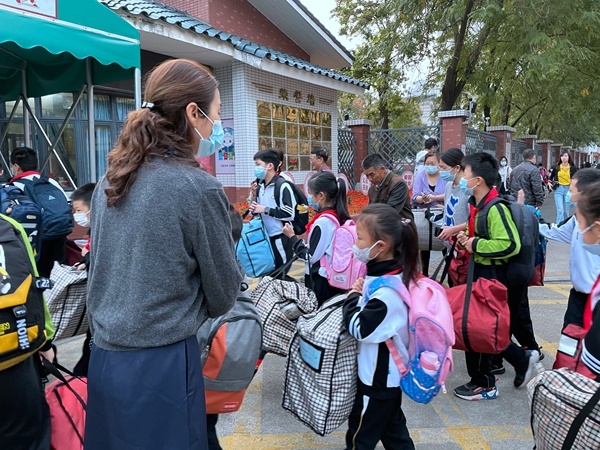 何校長、楊校長等全體行政已經在正門口迎接孩子們回校,他們跟同學們親切打招呼,高年級的隊員們自發組織了幫助小組,主動幫助低年級的學生搬睡具。同學們的問好聲,老師的關懷聲此起披伏,場面熱鬧而溫馨,構成一幅美麗的畫卷。