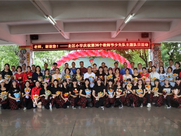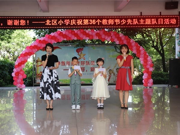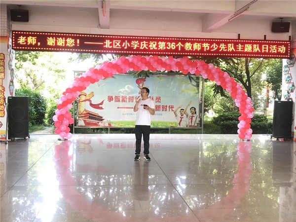 有人說:您是辛勤的園丁,用知識做露珠,培育祖國的花朵;有人說,您是無私的蠟燭,傾盡畢生精力,燃燒自己照亮別人??赡鷧s說:桃李滿天下,是您一生的夙愿;三尺講臺上的英姿颯爽,是您永遠的眷戀。您,就是這樣一個可愛可敬、和藹可親的人,像太陽,溫暖著學生的心;像月亮,照亮漆黑的夜空;像星星,指引夜行的身影;像雨露,滋潤著世界萬物!9月10日,迎來了第36個教師節,北區小學慶祝第36個教師節少先隊主題隊日活動在教學樓一樓大堂拉開帷幕,一出出精彩好戲輪番上演!