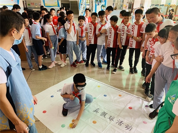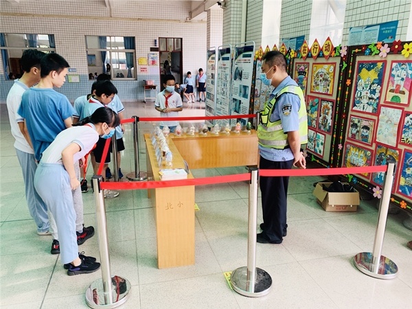 上午第一節課下課后,北區小學大堂人聲鼎沸,由社區組織的禁毒宣傳知識攤點小游戲在正如火如荼地開展著,學校三至六年級的學生分批參加各個攤點的小游戲,通過小游戲認識毒品、學習毒品知識,現場還設置了禁毒宣傳展覽,向學生形象地展示了真實的毒品是什么樣的。各個攤點的小游戲更是趣味與知識相結合:乒乓球投籃,學生要認識球上面的毒品名稱并投進相應的籃子為挑戰成功;禁毒知識問答,學生要答對答題卡上五道與禁毒知識有關的題目,學會分辨毒品;蛛絲馬跡,學生需要找出藏在書桌里的毒品或吸毒用具,并說出物品的名稱或使用方法,即為挑戰成功;還原真相:將桌上打亂的圖拼好,并說出物品的名稱。