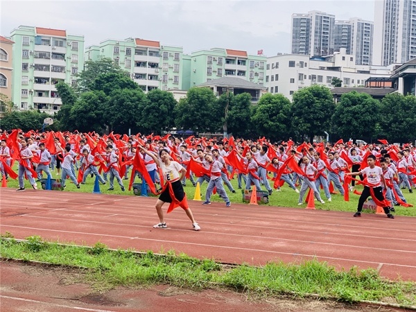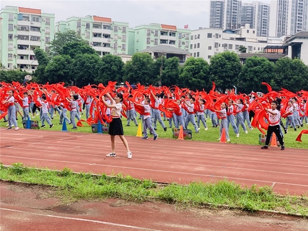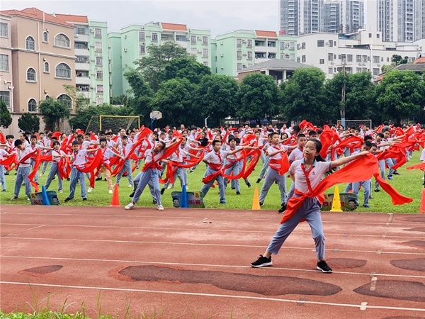 為了讓學生們進一步地了解感受水滸人物的獨特魅力,增強自身身體素質,北區小學經過研究討論,用《好漢歌》編排了一套活力滿滿,動感十足的校本操,搭配著節奏感非常強烈的歌曲,學生跳起來動感、精神。在動感、豪爽的步子中舞起腰間的紅綢帶,顫步晃頭,扭腰抖肩。整體動作爽朗風趣、活潑大方。搭配上熱情豪邁的《好漢歌》,既能感受到水滸英雄的疏朗豪情,又能很好地鍛煉身體,每日大課間鈴聲響起時,他們便會迫不及待地拿出屬于自己的紅綢帶,迅速地排好隊集中在操場上,跟隨著彭靜老師的口令學習集體舞動作。驕陽如火,孩子們手中的紅綢舞動起來,連成一片紅色的海洋。