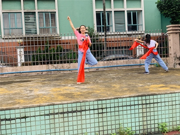 每個孩子的臉上都洋溢著燦爛的笑容,高年級的小朋友們學得快一些,動作有模有樣,踩著鼓點變化著腳步,揚起紅綢;低年級的弟弟妹妹們學得稍微慢一些,但跟著哥哥姐姐們搖擺著小手,跺著小腳,也是活力四射,精神滿滿。通過動感的音樂、豪邁的舞蹈動作,在舞蹈的過程中學生的全身心都沉浸在英雄好漢的豪邁情懷中,心中那份因疫情而沉寂的心情一下子被趕到九霄云外,因疫情而產生的小情緒都被動感的節奏所感染,孩子們個個都笑起來、跳起來、舞起來!