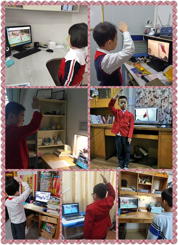 主題隊日活動以錄播視頻的形式進行,3月29日的上午,北區小學黨支部黨員教師代表、少工委部分成員教師戴著口罩回到熟悉的校園進行主題升旗儀式的視頻錄制工作。3月30日星期一上午8:00,全校一千多名學生穿著整齊的冬裝禮服,佩戴好紅領巾準備參加線上的主題隊日活動。活動第一項內容是主題升旗儀式,同學們看到熟悉的校園、熟悉的老師,心里激動不已,當雄壯的國歌響起時,同學們面向國旗,敬隊禮唱國歌,注視著鮮艷的五星紅旗緩緩升起,心中更是激動萬分,思念校園、思念老師、思念同學的情愫油然而生!