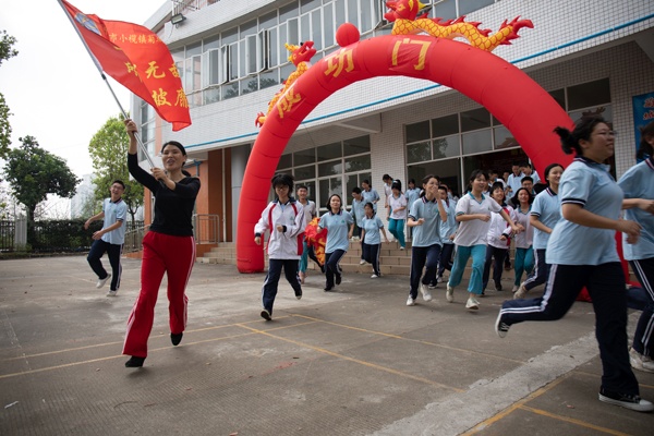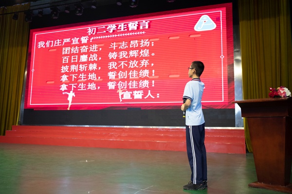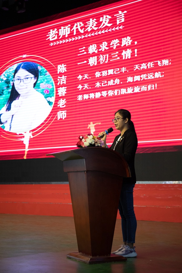 隨后由教師代表陳潔蓉老師發言,陳老師深情告訴孩子們:這是幸福與汗水共存的一百天,這是壓力與競爭交織的一百天,這是智慧與奮斗碰撞的一百天,這是身體與意志抗爭的一百天!這一百天可以鑄造輝煌,收獲成功,成就夢想!同時陳老師也代表著今年所有備戰中考的老師們向孩子們鄭重承諾:老師們將以飽滿的熱情,務實的作風投入到備考工作中,與你們同舟共濟,只愿助力你們揚帆遠航!