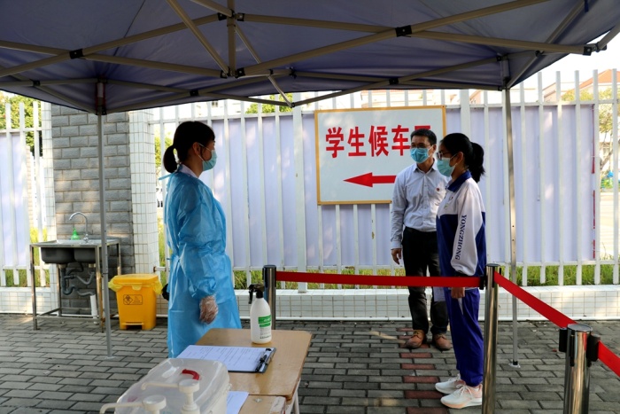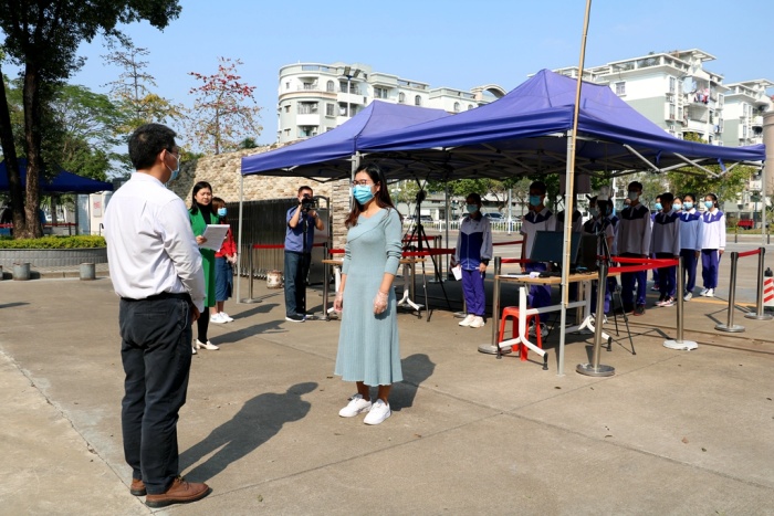 演練場(chǎng)景一,隨著現(xiàn)場(chǎng)總指揮陳清茂校長(zhǎng)宣布“演練開始”,60多名師生在值日行政領(lǐng)導(dǎo)的指揮下,戴著口罩在校門口集合點(diǎn)模擬“師生進(jìn)校門測(cè)量體溫”情境,以及發(fā)現(xiàn)學(xué)生體溫偏高的應(yīng)急處置流程。演練場(chǎng)景二,模擬課堂上突發(fā)學(xué)生出現(xiàn)身體不適(發(fā)燒并伴有咳嗽、胸悶等癥狀)應(yīng)急處置流程,以及如何啟動(dòng)《中山市永寧中學(xué)新冠肺炎疫情應(yīng)急處置預(yù)案》情境。參加演練師生們非常認(rèn)真,嚴(yán)格按照疫情防控操作流程進(jìn)行,應(yīng)急處置演練規(guī)范,師生們熟悉疫情防控知識(shí)和應(yīng)急處置操作流程。