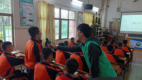 在課程開始前,禁毒社工現場讓學生們首先觀摩了一系列的仿真毒品,并且逐一進行了介紹,讓學生們都對毒品有一個初步的了解和認識。隨后,德育主任謝平老師在課堂上利用多媒體設備,以圖文并茂的方式詳細講解了毒品的種類和形狀,它對人體的危害和毒品等相關知識,以及吸食毒品對個人、家庭以及社會造成的嚴重危害。為了加深學生們的認識,課上還穿插了模擬吸毒的體驗環節,充分讓學生們感受到毒品對健康的危害。