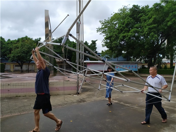 從清晨開始,劉萬軒校長就帶領全部行政人員舉行防臺風緊急預案分工會議,隨后分工開始對學校外面陳列品進行緊急轉移,對存在安全隱患的各類展示牌進行拆除,對學校的門窗、電器設備、大門進行加固。學校食堂采購人員備齊所有應急物資供,確保在校教師有充足的食品供應。全校嚴格執行“四停”有關要求,及時采取防風防雨應急響應措施,嚴格二十四小時值班巡視制度,把師生安全放在第一位,保證校園平安。