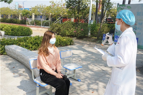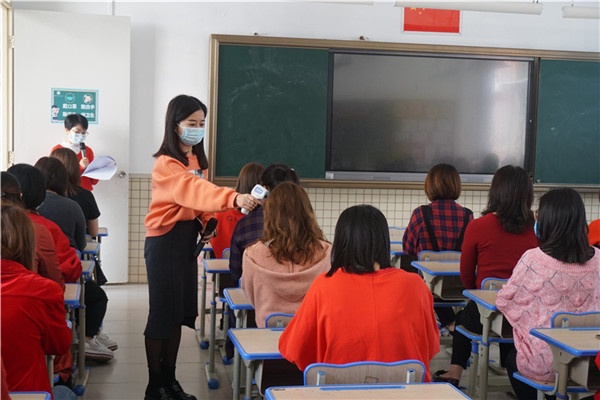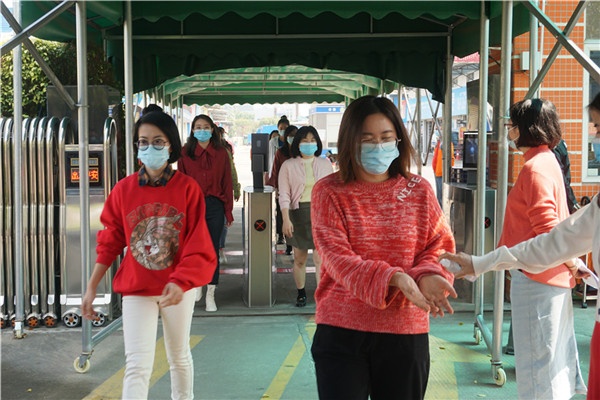 上午11時(shí)20分,在學(xué)校疫情防控工作領(lǐng)導(dǎo)小組的指導(dǎo)下進(jìn)行了演練;洪智躍主任一聲令下,演練開始了。在學(xué)校門口進(jìn)行了進(jìn)校晨檢演練,安保人員及值日教師按開學(xué)后的工作要求上崗,教職工佩戴口罩從正門進(jìn)入校園,人與人之間保持一米距離,依次完成測溫、手部消毒;篩查出發(fā)熱或疑似發(fā)熱人員,及時(shí)進(jìn)行妥善處理。