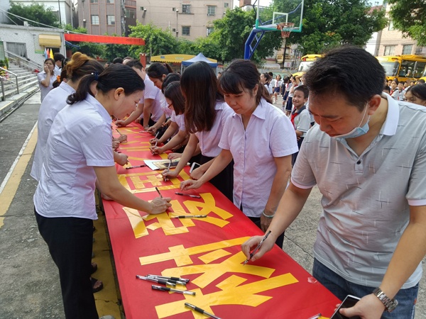 上午8時,伴隨著進場音樂,各班隊伍邁著整齊的步伐進入會場,同學們精神煥發,神采奕奕,列隊整齊。主持人開場后,舉行了升旗儀式,全體師生齊唱國歌。隨后,成婷校長發表了國旗下講話,她慷慨激昂,帶領全體師生共同緬懷新中國成立以來的艱辛歷程,感慨新時代美好生活的來之不易,號召師生們凝聚愛國力量,投身工作和學習中,為祖國喝彩,為夢想加油!接著,全體師生齊唱《歌唱祖國》,嘹亮的歌聲回響整個校園,同學們還深情表演了手語操《我和我的祖國》,為祖國生日獻禮。在接下來的簽名寄語環節中,師生們在愛國宣言橫幅上莊重的簽上名字,表達熱愛祖國的情懷。最后,德育處王曠主任帶領全體同學宣誓,立志發憤圖強,為偉大復興的“中國夢”而努力奮斗!
