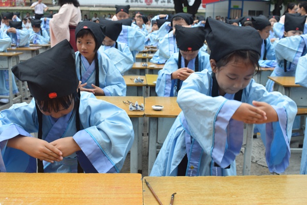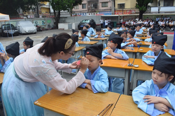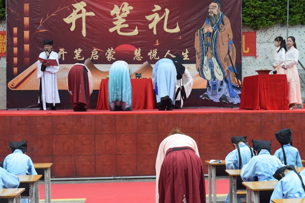 本次“開筆禮”儀式包括:正衣冠、禮拜先師、敬謝父母、敬拜師長、朱砂啟智、書字明理、擊鼓鳴志、經典立志等多個環節。