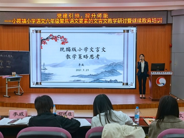 春風解意,繁花相迎。為不斷探索小學語文課堂教學有效策略,解決教學中存在困惑,提高教師教學能力,2021年3月24日下午,小欖鎮小學六年級一百多位語文教師齊聚升平小學,參加 “黨建引領 提升師能--小欖鎮小學語文六年級聚焦語文要素的文言文教學研討暨繼續教育培訓”。小欖鎮小學語文中心組的部分成員、升平小學何德雄校長也參加了培訓活動。此次活動由于小欖鎮李威名師工作室承辦。