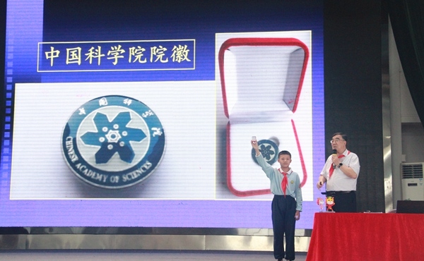 徐教授一進會場,全場爆起雷鳴般的掌聲,學生代表上臺給徐教授戴上紅領巾,并送上校慶紀念品——校娃,代表學校對徐教授的到來表示熱烈的歡迎。