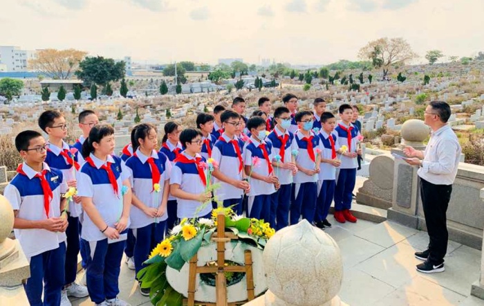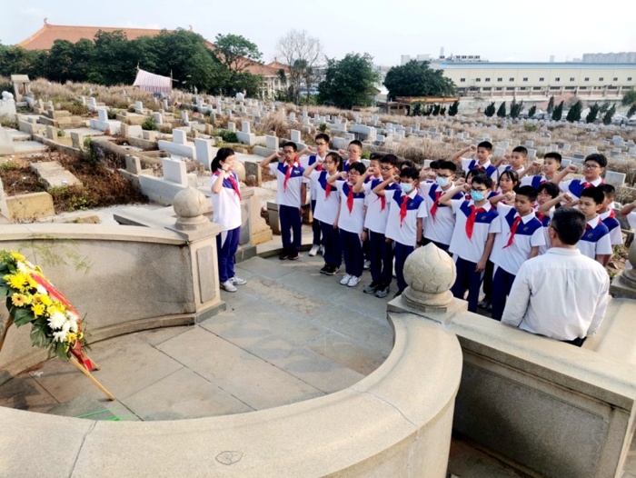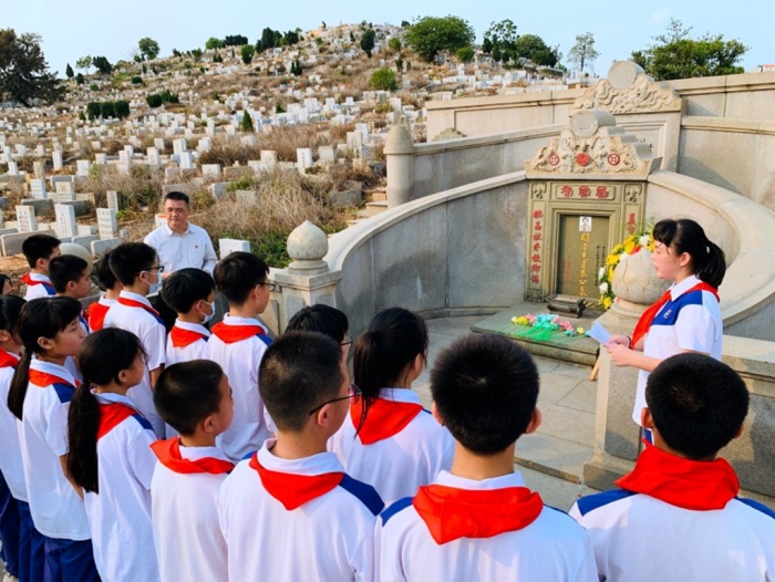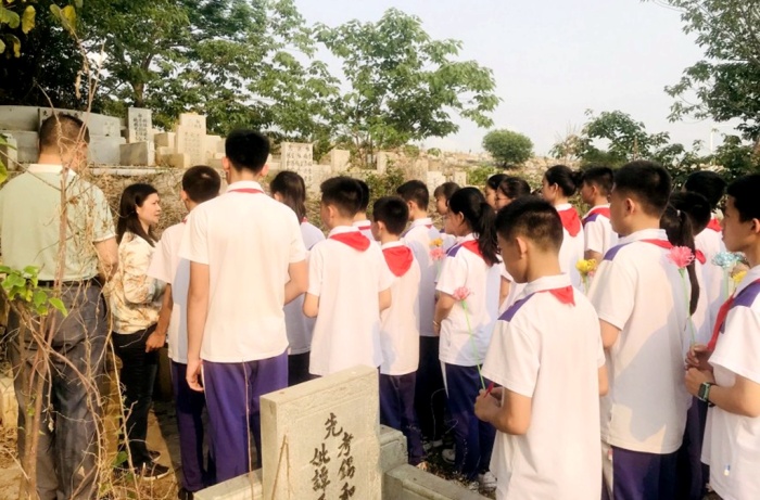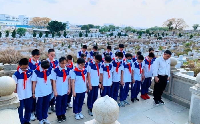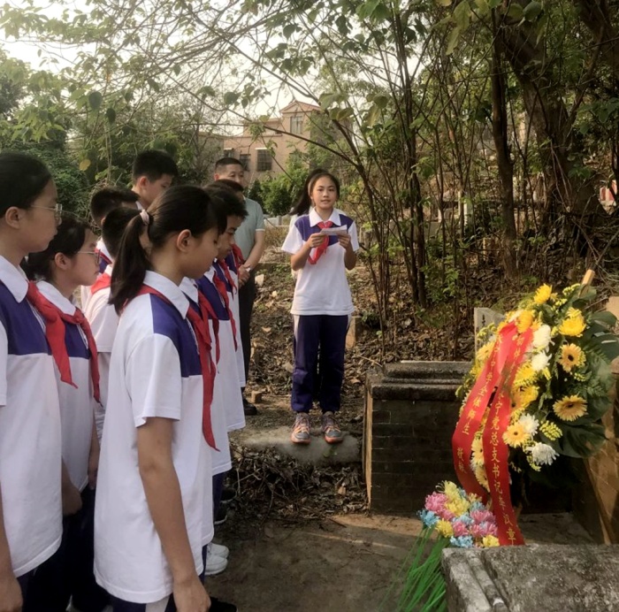 活動分為兩小組,第一小組由楊青華副校長帶隊前往永寧鄉前黨總支部書記李漢章先生的墓前。同學們獻上花圈和自做的紙花,瞻仰墓碑。羅結晶副主任介紹了老書記在永寧農業合作化期間組織開創領導班子“入黨為公、掌權為民,為黨爭輝、為民造福”;“一心為公,艱苦奮斗,拼搏進取,無私奉獻”的永寧人精神。李漢章為永寧打下了堅實的經濟基礎,也為永寧人留下了寶貴的精神財富。改革開放后,永寧人代代相傳,永寧事業不斷發展。1985年,永寧鄉成為廣東省最早的“億萬富翁”。李漢章老書記在工作中甘當“為人民服務的孺子牛”、“創新發展的拓荒牛”、“艱苦奮斗的老黃牛”。楊青華副校長也勉勵少先隊員們要珍惜今天來之不易的幸福生活和良好的學習環境,刻苦學習奮發成才,在中國共產黨建黨100周年和十四五規劃的開局之年,發揚“三牛”精神,在全面建設社會主義現代化國家新征程上奮勇前進,貢獻力量。