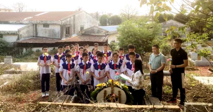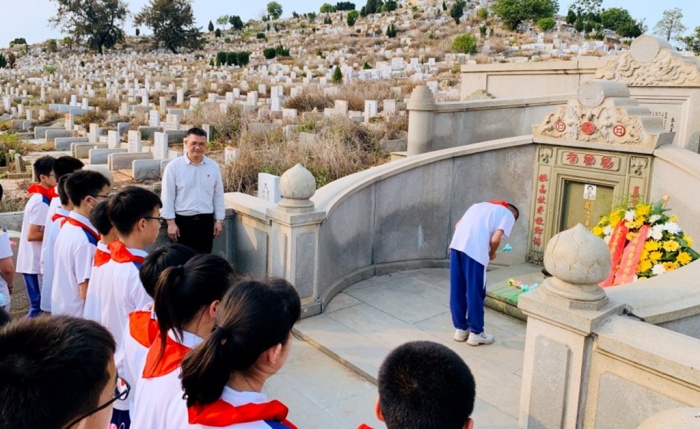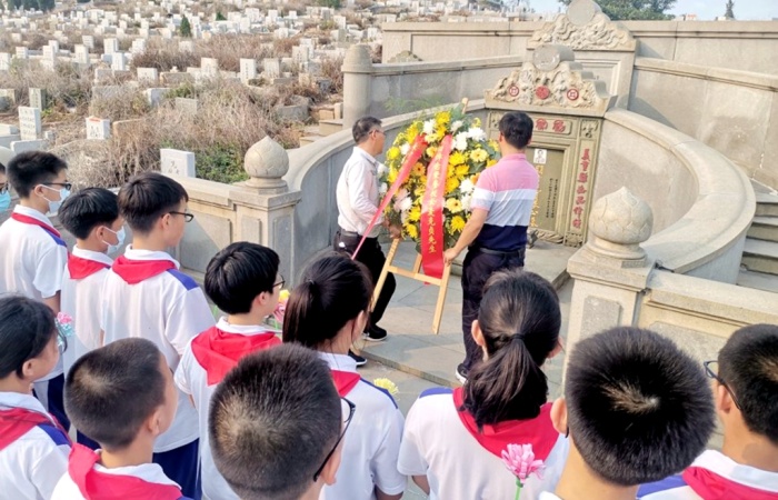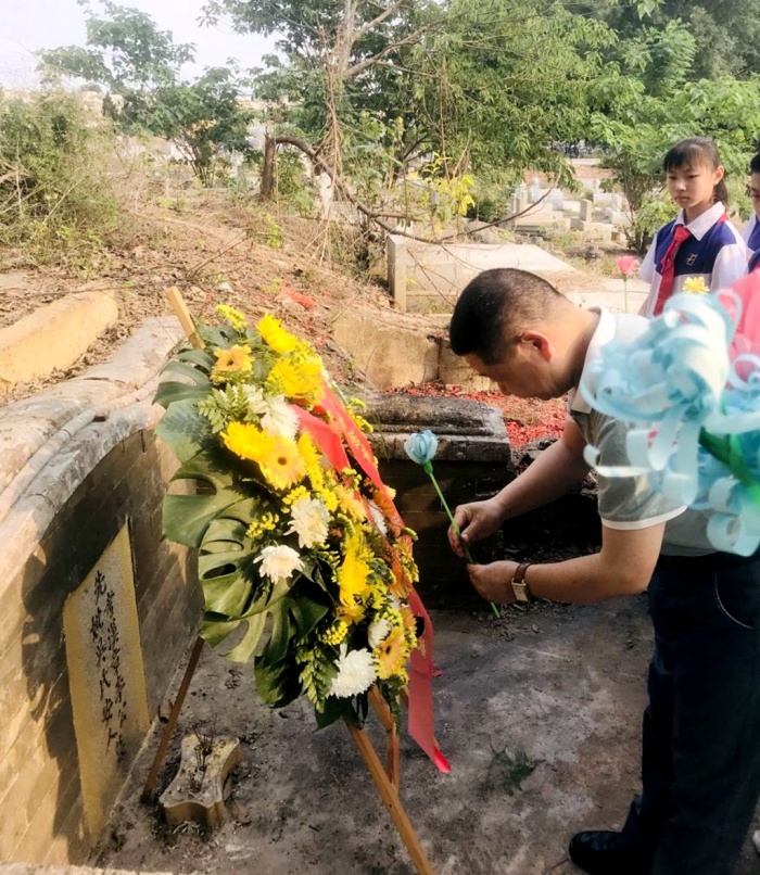 第二小組由戴放良主任帶隊前往永寧中學名譽校長麥克貞先生的墓前。同學們首先獻上了花圈和紙花,瞻仰墓碑。接著,戴主任介紹了麥克貞先生事業有成回報家鄉的一片愛心。號召同學們學習麥克貞先生的家國情懷。