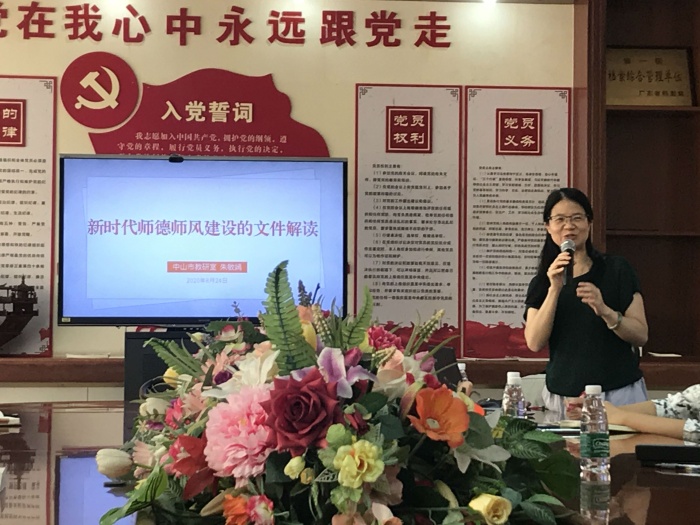 活動伊始,主持人張丹老師向大家鄭重介紹了朱敏嫣老師。隨后,朱老師結合了許多實實在在的數據以及身邊鮮活的案例,從新時代師德師風建設的文件解讀、全面加強教師隊伍思想政治工作、大力提升教師職業道德修養三部分深入淺出地為全體教師進行講解。最后,副校長楊志堅對此次活動做了總結性發言。