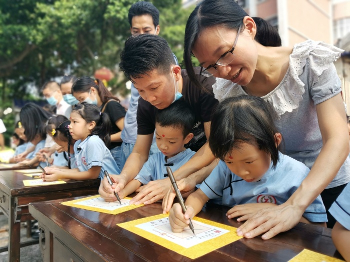 “開筆禮”活動在煙洲書院舉行,煙洲小學131名一年級新生及其家長參加了此項盛典。孩子們懷著無限的憧憬和期待,在老師們和家長們的引領下,在擁有147年歷史的煙洲書院中開啟了人生的新篇章。“開筆禮”在副校長楊志堅敲響的鐘聲中拉開了帷幕,活潑可愛的孩子們認真聆聽了校長黃文華的對他們的諄諄教誨,接著在悠揚的傳統(tǒng)音樂聲中,老師們?yōu)槿w孩子“朱砂啟智”,寓意孩子們能夠開啟智慧,從此耳聰目明、心靈手巧。然后就是家長們認真地教孩子們書寫“人”字。以“人”開筆,寓意著孩子從小就要認識到學會做人的重要性,將來做一個頂天立地的人。“人”字寫好后,孩子們由家長領著緩緩走進莊嚴神圣的煙洲書院參拜萬世先師孔子。羅勇志老師帶領全體學生整理衣冠,誦《弟子規(guī)》(節(jié)選),三拜圣人孔子,三擊鼓明志,三位學生代表向老師敬茶,這些都寓意著學生們要尊師孝親、崇德立志、仁愛處世的中華傳統(tǒng)文化精髓,樹立“善 ” “正 ”行為規(guī)范,汲取尊師愛學的思想精華。最后,何彩云老師代表全體老師作了發(fā)言,表了決心。