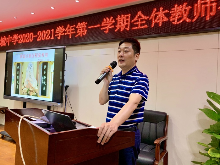 會議最后,新任鐵中校長汪澎湃正式登臺亮相。他首先盛贊鐵中首屆學子在2020年中考開創學校歷史,首獲大捷。高度贊揚了為取得輝煌成績而努力與無私付出的初三全體老師。感謝在如火如荼的8月,自覺回校加班的行政、不畏酷暑,為創文助力的鐵中教師志愿者,是他們的無私奉獻使鐵中更美了。