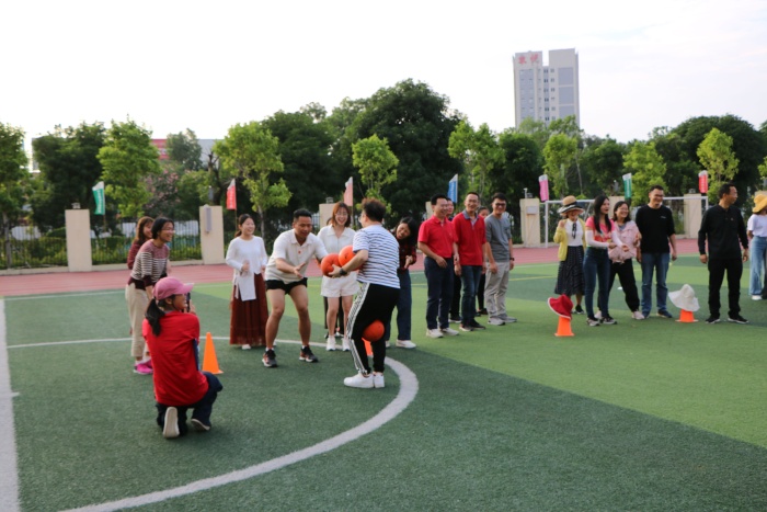 本次活動最激烈的要屬“旋風跑”了,各個年級組的老師們之間配合相當默契,五位老師手拉手站成一排,用雙手扶住一根竹竿,從起點出發繞過標志桶再回到起點第二組出發,現場的氣氛瞬間被大家的活力點燃。同呼吸,共命運,老師們節奏統一,步伐一致,這不僅是智慧和體力的角逐,還是團結協作的完美比拼。