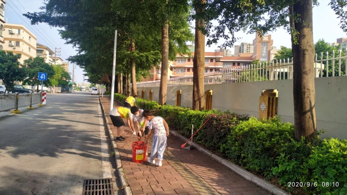 教務主任莫振佩帶領部分人員負責校門口廣學路的垃圾清理,主要包括移除校園周邊花圃里的枯樹枝,清除白色垃圾、煙頭,清掃路邊的樹葉等,大家帶齊清潔工具很快行動,個別家長志愿者也主動加入勞動隊伍。德育主任許向陽帶領各年級級長們對各年級的教室、走廊、廁所等衛生情況進行全面排查,對有疏漏部分立即處理。德育主任梁超勝負責廚房的衛生檢查以及校門口、班級、校車上疫情防控物資的落實,如人體測溫儀、消毒液、防護口罩等。校長黃飛躍負責張貼校門口“一米間隔”防控標識和宣傳標語。經過一個小時的奮戰,自查整改工作初步完成。