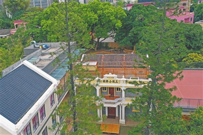 三溪小學校由當地華僑于1931年捐資興建,一磚一瓦,皆體現了華僑對家鄉的熱愛,水泥鋼筋全是進口,因此十分耐用,其折中主義建筑風格中西合璧,既有卷草花紋的西式浮雕,也有中國特色的回紋元素。屋頂的女兒墻上,我們依然可見“劉九記造,民國二十年”的字樣。