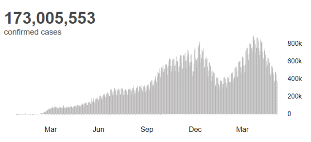 根據世衛組織最新實時統計數據,截至歐洲中部夏令時間6月7日16時55分(北京時間6月7日22時55分),全球累計新冠肺炎確診病例173005553例,累計死亡病例3727605例。7日全球新冠肺炎確診病例新增368456例,死亡病例新增8661例。