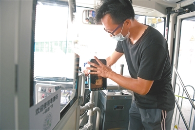 6月21日,中山通的工作人員在升級調試公交車上的刷卡設備。本報記者 繆曉劍 攝