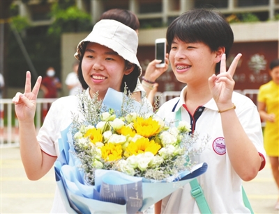12時20分,市實驗中學門前的東江路兩旁停滿了車。梁先生夫婦帶著小兒子正在等待女兒黃美禎走出校門。“祝賀同學們,考完啦!”一位穿紅色衣服的老師站在校門口熱情地向走出校門的同學們喊著。5分鐘后,黃美禎拖著行李箱出現在校門前,弟弟高興地跳起,把花遞給姐姐。“姐姐讀了十幾年書了,真的很辛苦,高考完,我們家長也如釋重負。”黃女士向記者表示,當晚會好好慶祝女兒高考結束。