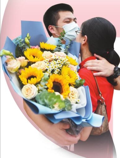 家長給孩子送花,緊緊相擁。