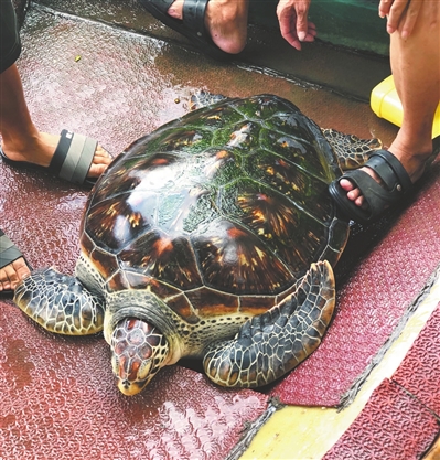 6月9日,中山市黃圃鎮馬安村內河,一只31.5公斤重的海龜被廢棄漁網困住。熱心市民黃先生發現后,立即與其父駕駛船舶將海龜解救并打撈上船,并請求中山市海洋綜合執法支隊予以救助。經現場鑒定測量,該海龜為國家一級保護野生動物綠海龜,體長73厘米、寬52厘米,體重31.5公斤。目前,該海龜因發現及時施救得當狀態良好,待它適應野外生存條件后,將被中山海洋綜合執法支隊護送放歸海洋。