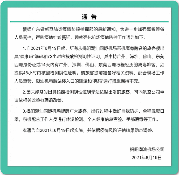 據“揭陽發布”微信公眾號消息,揭陽潮汕機場公司發布通告,6月19日起,所有從揭陽潮汕國際機場乘機離粵跨省的旅客須出具“健康碼”綠碼和72小時內核酸檢測陰性證明,其中持廣州、深圳、佛山、東莞四地身份證或14天內有廣州、深圳、佛山、東莞四地行程經歷的離粵旅客,須提供48小時內核酸檢測陰性證明。請旅客提前準備好相關資料,配合現場工作人員查驗,潮汕機場航站樓入口的測溫和“亮碼”通行措施保持不變。