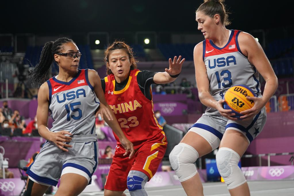 7月26日,中國隊球員王麗麗(中)在比賽中拼搶。新華社記者 張笑宇 攝