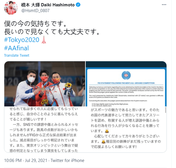 隨后,橋本大輝也在自己的個(gè)人社交媒體賬號上發(fā)文回應(yīng)此事,他發(fā)了一張三位獲獎(jiǎng)選手的合影和打分明細(xì)的圖片并配以長文。橋本大輝寫道:“這兩天我收到了人們的贊美、同時(shí)也在網(wǎng)上聽見了很多誹謗和中傷的聲音。這次我(單腳踩出界)的14.7分的分?jǐn)?shù)雖然讓人覺得存在疑問,但是這個(gè)項(xiàng)目得扣分情況已經(jīng)清楚地列出來了。我們運(yùn)動(dòng)員都一樣,在比賽中必須要面對嚴(yán)格的評判和分?jǐn)?shù),這次比賽也是如此,分?jǐn)?shù)都是客觀給出、而不是主觀打分的,我相信所有在場選手也都知道這些規(guī)則。雖然奧運(yùn)會還在繼續(xù),但是能夠在臺上和大家比拼已經(jīng)是我很寶貴的經(jīng)歷,互相切磋、互相贊美,這就是體育比賽的魅力所在。因此,我希望贊美奧運(yùn)運(yùn)動(dòng)員的人可以更多、而攻擊謾罵的聲音可以變得更少。”