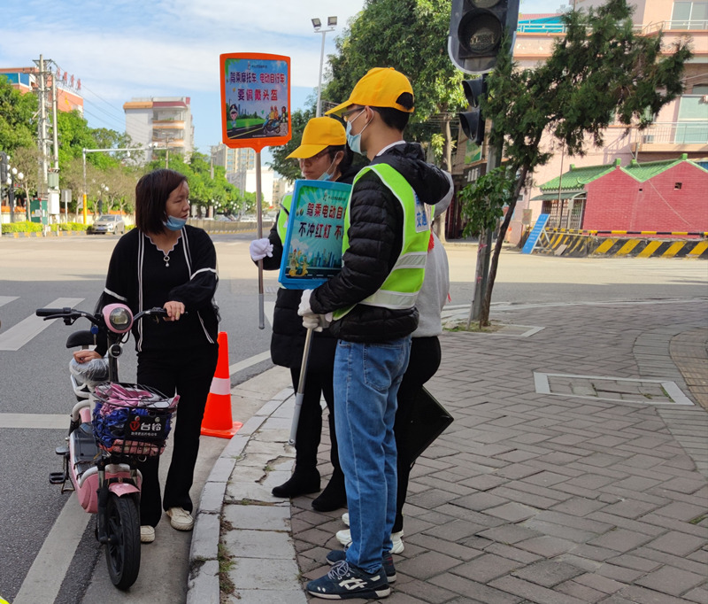 從11月起,不少市民留意到,中山市南頭鎮(zhèn)多個路口出現(xiàn)了一群醒目的身影:他們身穿熒光色志愿者馬甲,頭戴小黃帽,手舉勸導(dǎo)牌,勸告來來往往的摩托車、電動自行車駕乘人員遵守交通法規(guī),佩戴安全頭盔。