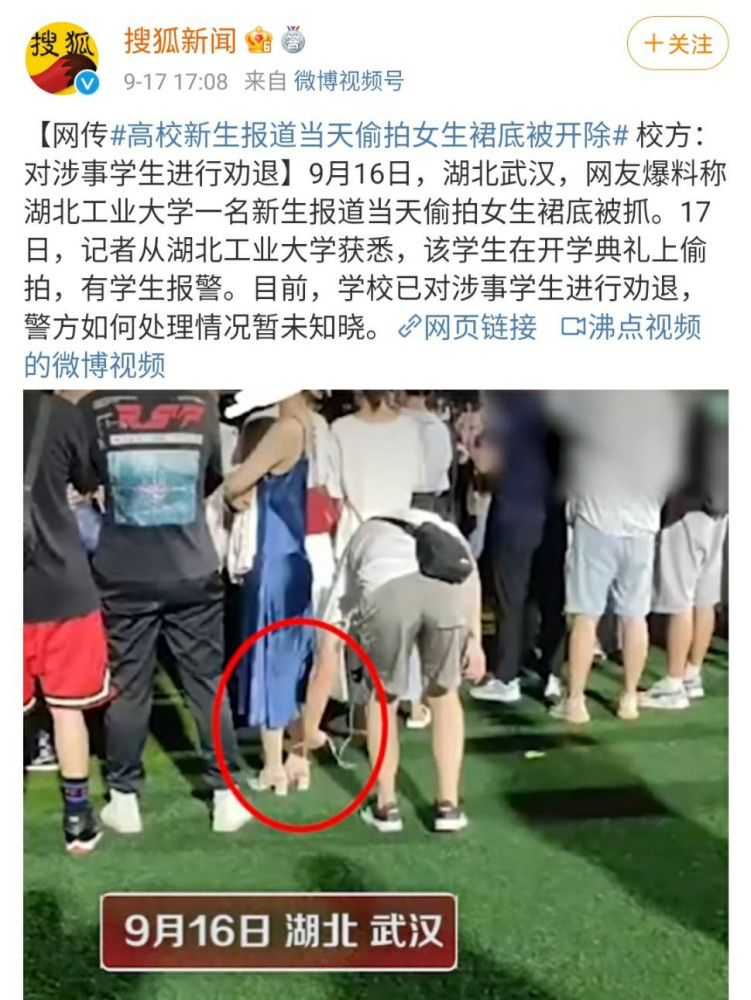 湖北工業(yè)大學(xué)的一位大一新生胡某,在開學(xué)報到后第二天晚上,在學(xué)校操場用手機(jī)偷拍女生裙底,被當(dāng)場發(fā)現(xiàn)抓獲。根據(jù)湖北工業(yè)大學(xué)的通報,事發(fā)后這位新生和家長同意自動退學(xué),在9月16日上午,也就是他入學(xué)報到的第三天,離開學(xué)校。