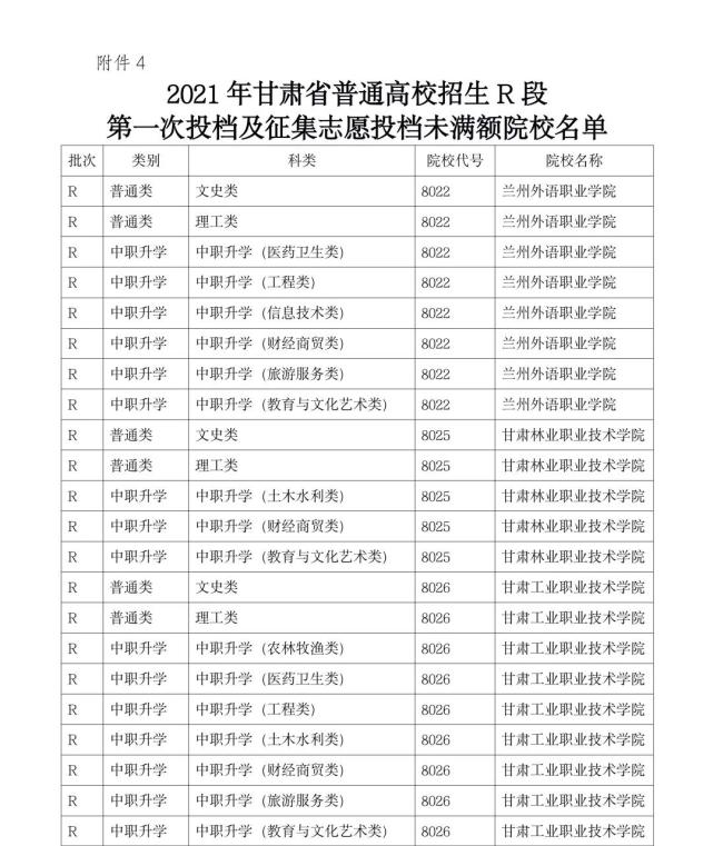 各招生院校按照招生專業(yè)和錄取方式于10月26日-30日完成錄取。參加過甘肅省2021年普通高考及中職升學考試且具有成績的考生,按照不低于報考院校2021年高考錄取第一次投檔相應類別最低錄取分數(shù)線要求,由招生院校擇優(yōu)線上錄取,其中在高考R段錄取過程中第一次投檔及兩次征集志愿投檔均未滿額的院校除外。參加招生院校統(tǒng)一組織文化素質(zhì)測試的考生,由招生院校按照考試成績從高到低,按公布的招生計劃擇優(yōu)錄取。