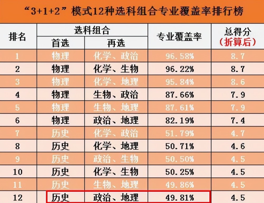 在12種選科組合有一種,是比較不被老師推薦的,那就是史政地的組合,史政地組合從專業(yè)覆蓋率來(lái)說(shuō)就只有50%不到,也就是說(shuō)選擇這組學(xué)科的學(xué)生,可能有一大半專業(yè)不能選擇,尤其是首選歷史就相當(dāng)于與放棄了理工類專業(yè)。