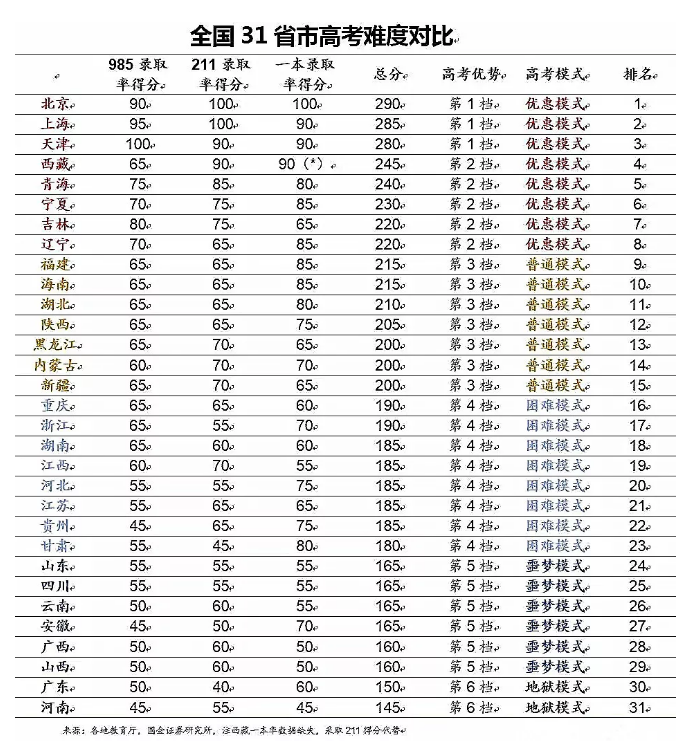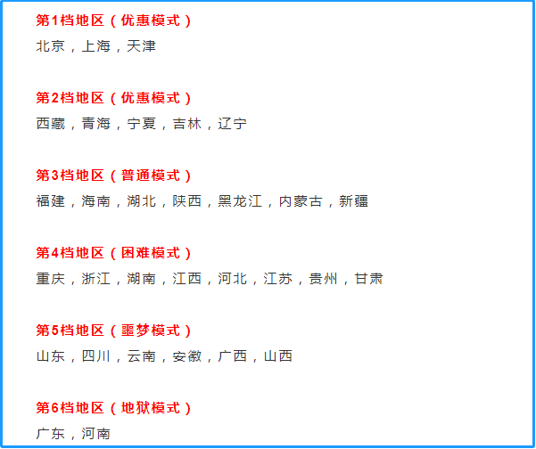 所以今天,我們不妨把高考難度分為“6大等級”,分別給大家盤點一下,你所在的地區(qū)高考究竟有多難。