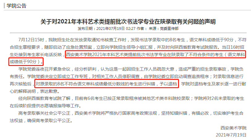 第二個原因就是考生的單科成績。比如2021年重慶工商大學的英語專業的單科成績要求110分及以上。如果考生的高考總成績達到重慶工商大學英語專業的最低提檔線,但英語成績不到110分,即使考試院投檔到重慶工商大學,但大學招辦在審核專業要求時發現考生單科成績不達標,就會退檔。比如今年網上傳得沸沸揚揚西安美術學院8名書法學專業的考生因語文成績不足90分被退檔。雖然退檔的部分原因系招辦人員失職,但考生沒有了解該專業的單科成績要求而填報這個專業則是造成退檔的主要原因。