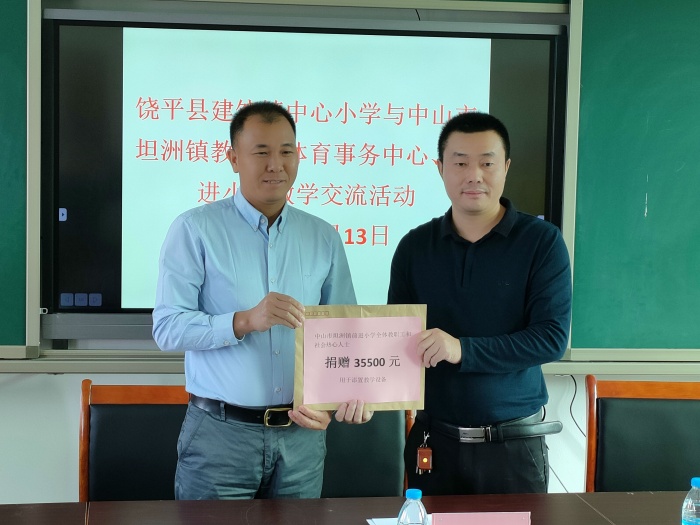 隨后,由張志略主任代表坦洲鎮教育和體育事務中心、郭炳森校長代表坦洲鎮前進小學教職員工和熱心人士分別向建饒鎮中心小學捐贈教學設備。 下午,一行走訪了遠離鎮區的秀溪小學,向秀溪小學的全體學生捐贈了文具,并勉勵同學們好好學習。