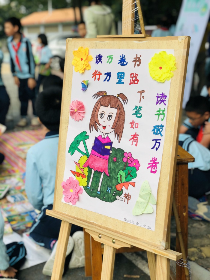 啟動儀式結束后,曬書活動正式開啟,全體師生以及班級家委的一齊參與讓整個校園沸騰起來。全校14個班級可謂八仙過海各顯神通,無論是曬書攤位的布置還是同學們以書換書的創意,都讓人大開眼界:三(3)班的 “瓶水齋”奪人眼球;四(1)班的 “淘書樂”精美別致,讓人耳目一新;四(3)班“會移動”的海報,真讓人拍手叫絕;五年級同學制作的各類精美海報,讓人嘖嘖贊嘆……還有各種換書抽獎,換書贈書簽等植入的小活動,把曬書活動推向了高潮,整個校園洋溢著歡聲笑語。一個小時的曬書活動接近尾聲,喧囂過后,整個校園又是一幅別樣的寧靜:換得心愛之書的孩子們不約而同,在校園的各個角落,席地而坐,手捧書籍,靜靜閱讀,閱讀的美好在這里悄然而生。