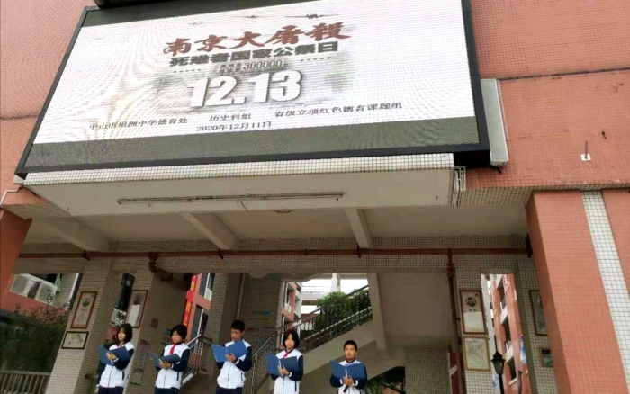 在紀(jì)念活動的第二部分,鄒老師介紹了南京大屠殺的概況,并重溫了國家設(shè)立南京大屠殺公祭日紀(jì)念活動的相關(guān)視頻,悲壯的音樂、肅穆的畫面,讓全體師生仿佛重回到了83年前的南京,看到了河山被踐踏、同胞被屠殺。最后全體師生情悲意堅(jiān),握緊拳頭、抬起頭顱高聲齊誦公祭日的《和平宣言》。活動后,校長吳劍文勉勵全體師生要銘記歷史傳承精神、勿忘國恥振興中華,要教師踐行立德樹人為人師表,要學(xué)生學(xué)好本領(lǐng)報(bào)效祖國。