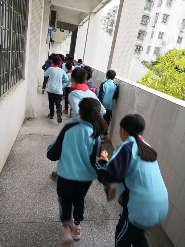 上午8:10,當“嗚---”一聲熟悉的的警報聲響起,孩子們便紛紛跑出教室,有的貓著腰,有的用手捂著口鼻,有的用袖子掩著面孔只留一點縫隙露出明亮的眼睛,按事先預設的逃生通道緊張、有序地向安全地帶逃離;隨后各班班主任清點人數,并層層匯報。整個過程用時1分28秒。